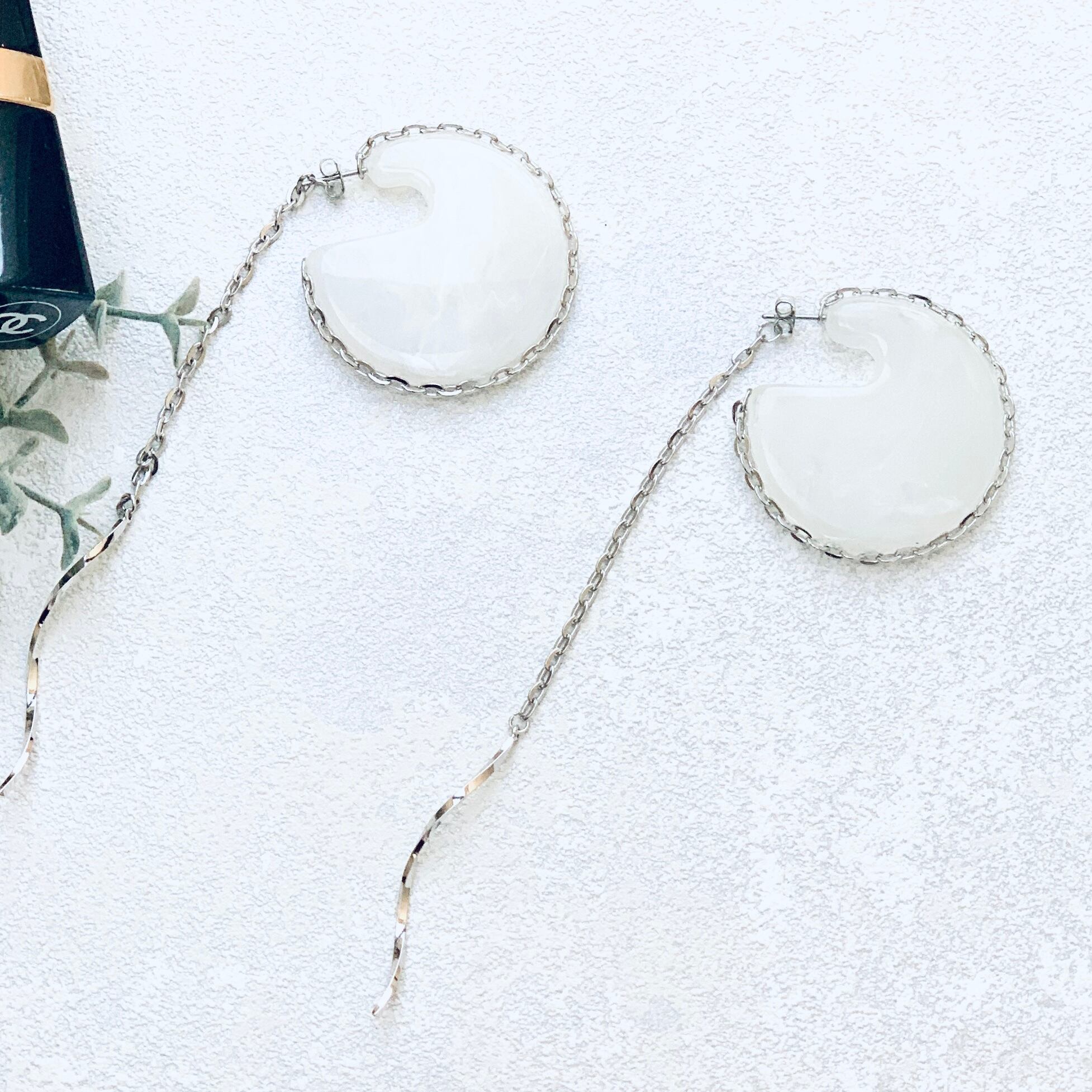 夏に向けて涼しげなクリアとホワイトのマーブルになってます。長いチェーンはキャッチに付いてます。