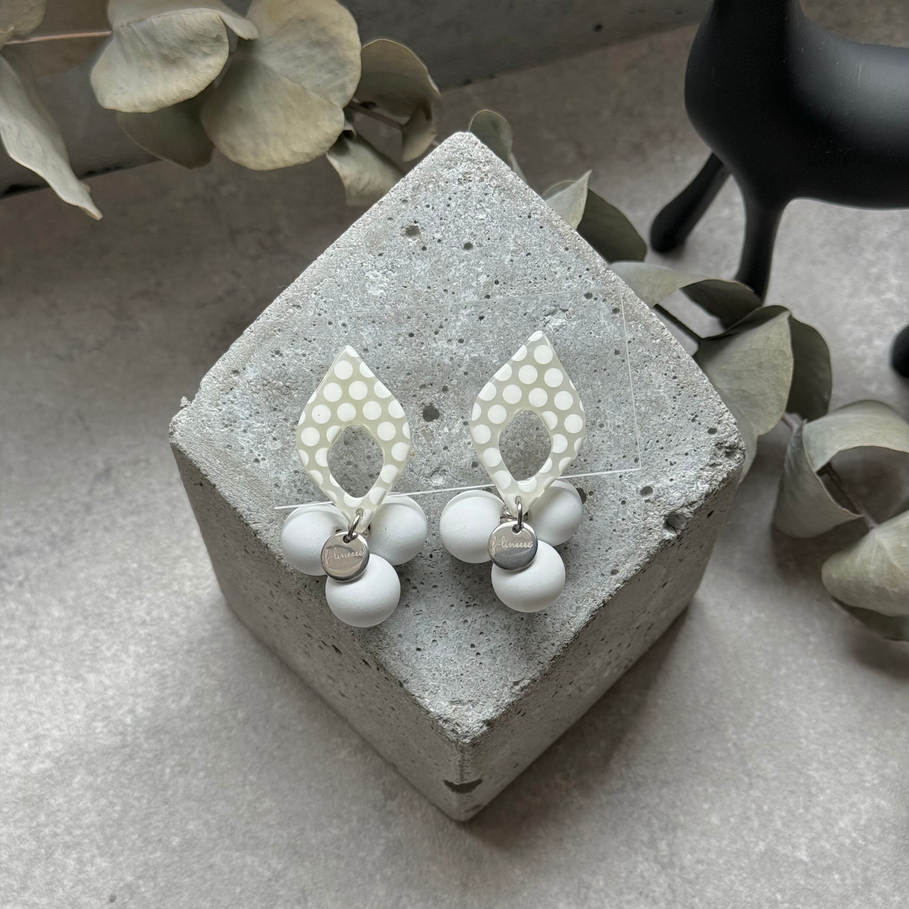 matte whiteのラウンドビーズとドットの組み合わせが、大人かわいい印象を醸し出します。どんなスタイルにもマッチし、日常使いから特別なシーンまで幅広く活躍すること間違いなしです