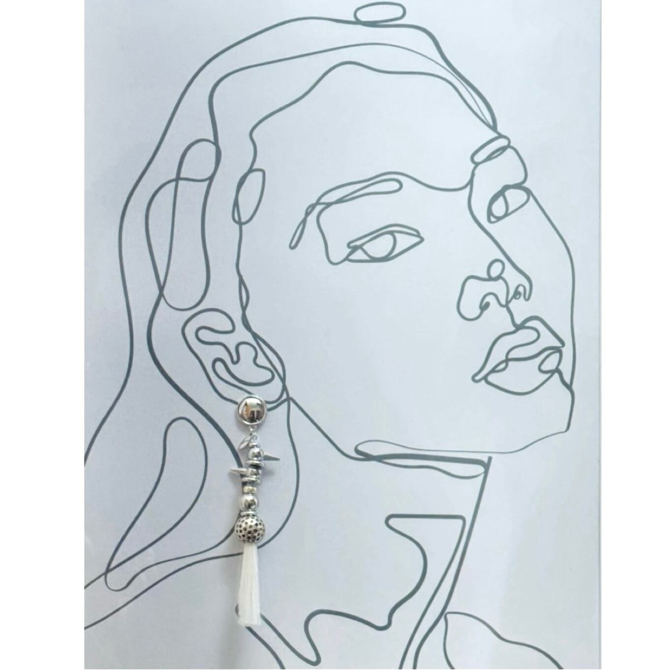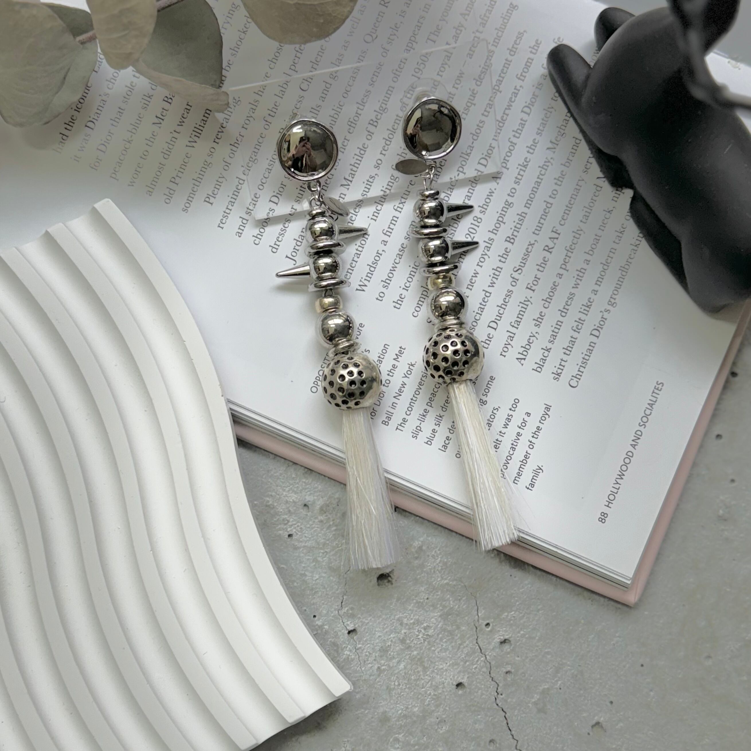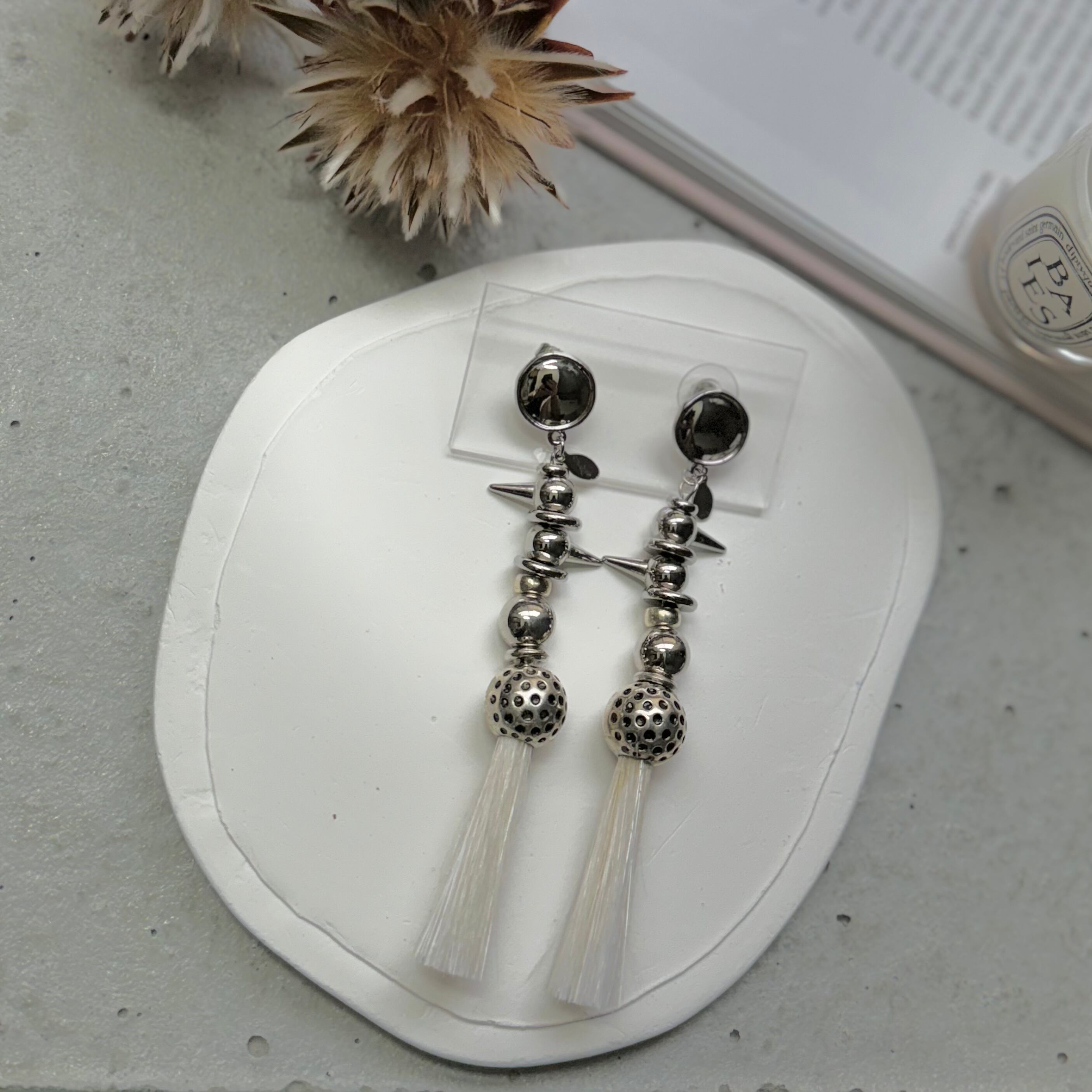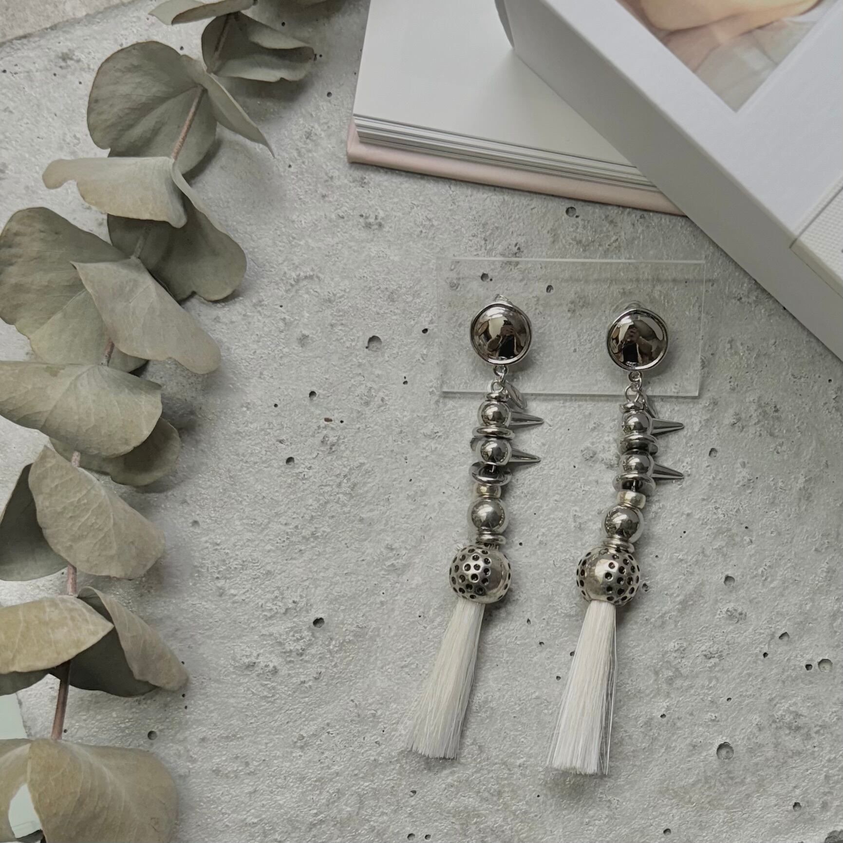 シルバーのトゲトゲパーツにメイクブラシなどにも使われている山羊毛のタッセルがアクセント